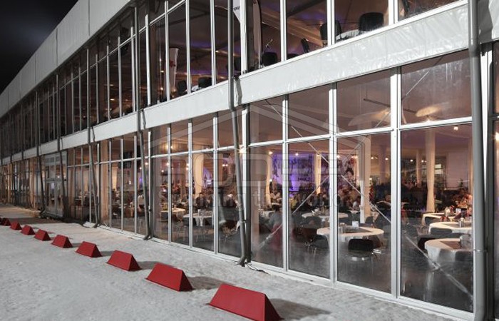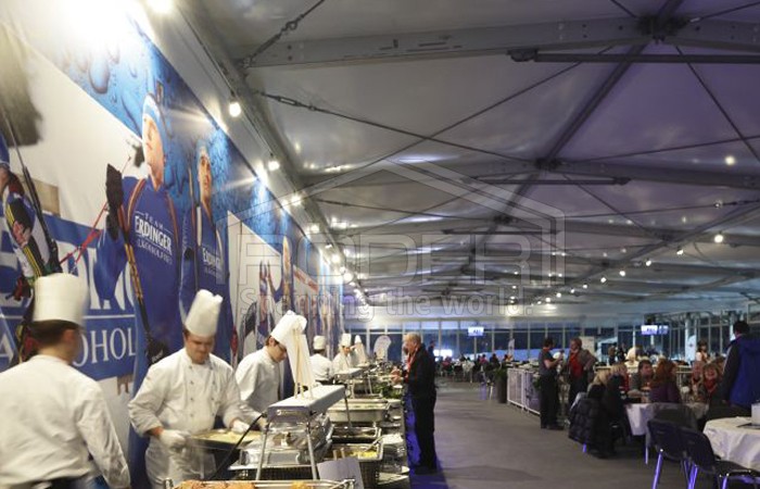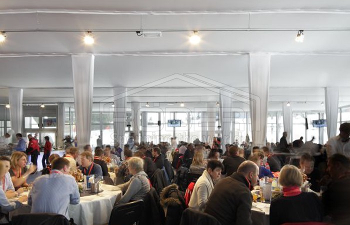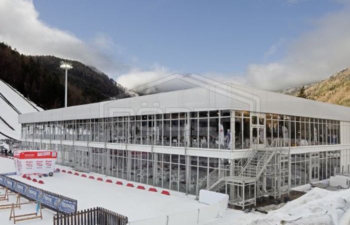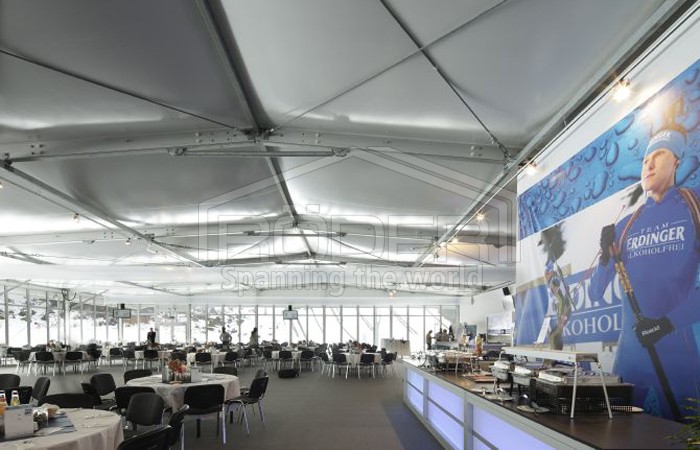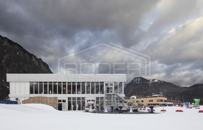 尽管出现了极端的天气,瑞德尔篷房的搭建只花了四个星期,并且成为了一道相当壮观的景象:一个30x60米的瑞德尔Solution Highend篷房用作主要的贵宾篷房,在世界杯期间为每天多达1700名客人提供了休憩场所。这个篷房正面的80%由玻璃构成,为贵宾提供了观看运动场面绝佳的角度,他们可以看到出发点、射击场和Omega赛道。篷房内部有着一流的设施,两个楼层都有厨房和托儿所,为四个赞助区提供最优质的舒适感受。此外,贵宾篷房还和主赛场相连。