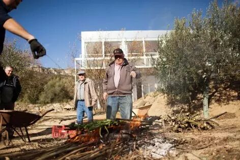在新家渐渐落成的过程中,业主一家人就住在施工场地的前面。每到夏天,他们在榛树林中玩耍沐浴,在屋顶野营。这种长期的互动使我们和他们的家人、建造工人、当地手工艺人的关系更加紧密。为了庆祝这个项目的完满合作,在冬季盛而大传统的calçotada节,我们邀请每一个人一起准备大餐一起狂欢。