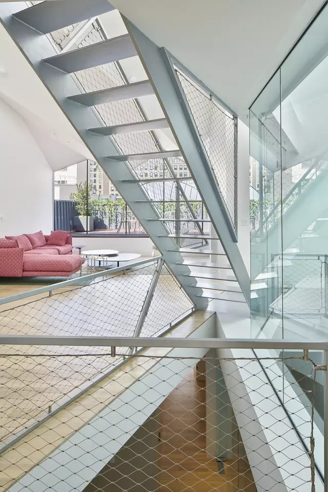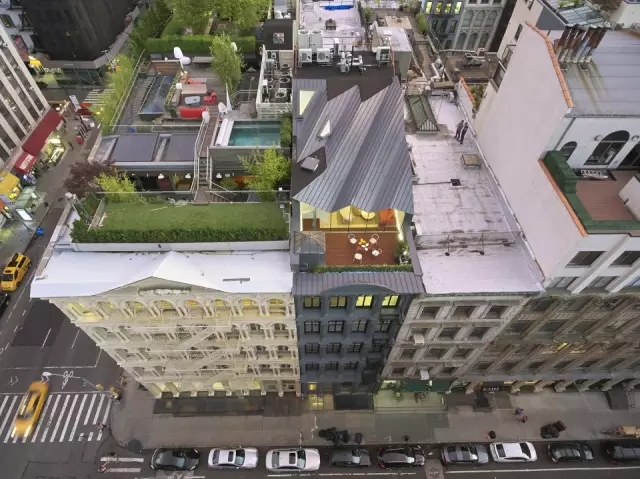 其将自然形态元素和城市生活的想法结合在一起打造了新鲜的公寓室内和公共空间。大堂镶嵌的绿色墙壁和2楼、6楼、7楼郁郁葱葱的植物和阳台强调了室内与室外的联系。山形墙的后面设有一个隐形的下沉露台,可以欣赏带有Woolworth建筑的景观。老旧电梯的舱壁被改造成了热水浴缸。在曲折的屋顶后方的夹层里,能够看到曼哈顿下城和自由塔的景观。