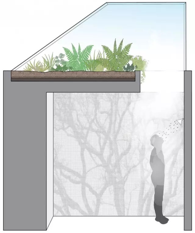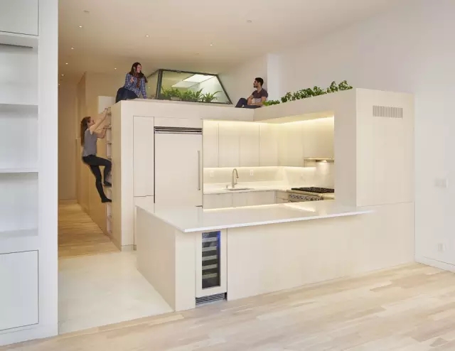每户改造公寓的卧室和起居室之间的顶部区域有用于卫生间和储藏用途的“第三个空间”。这个层高低于4英尺的盆景公寓也配备了带有蒲团的休息区域。厨房上方是一个草本花园,栽有蕨类植物的草本花园直接与楼下的主浴室相连。浴室的水蒸气可以收集起来浇灌植物和花园。.jpg)