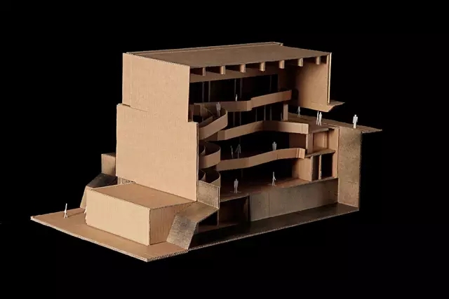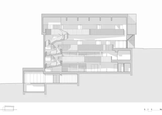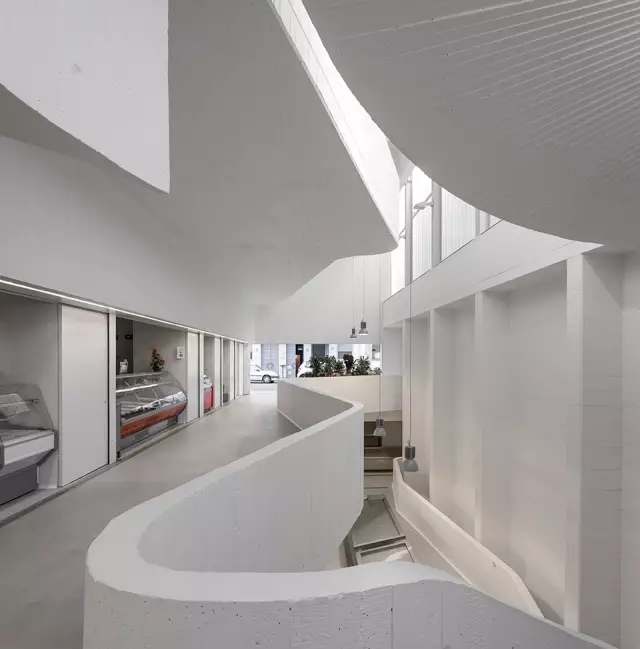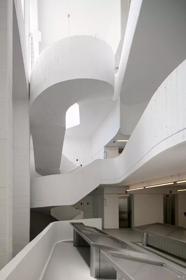 建筑内部的南侧有一个用混凝土打造然后涂成白色的螺旋式楼梯,这个楼梯就是这个建筑,或者说这个城市公共空间中的一条街。两个贯通建筑的中庭充盈着光线,联系并为各个层面带来光明。