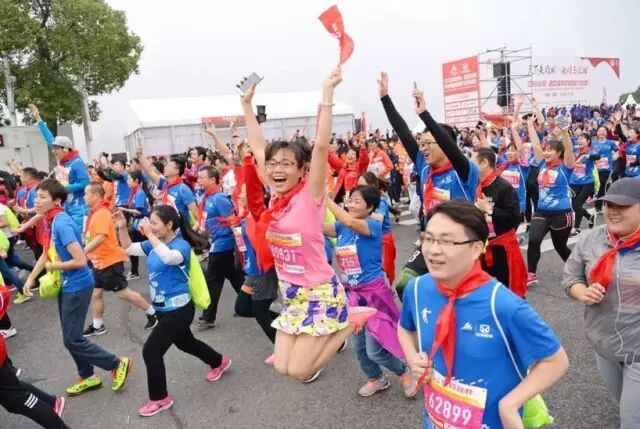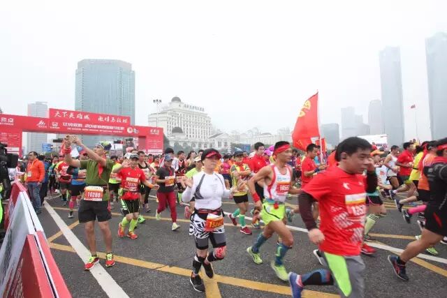 早上6点开始就陆续有热情的参赛选手开始在起点集结。现场人潮涌动,红、橙、蓝三色的艳丽服装让现场汇聚成一片欢乐多彩的海洋。随着国歌的奏响,凝聚了上万人的秋水广场立即群情激荡,斗志昂扬。8时整赛事鸣枪。来自国外的特邀运动员和国内的专业运动员率先冲出起跑线,随后15000人的队伍在他们的引领下浩浩荡荡,欢呼前行。