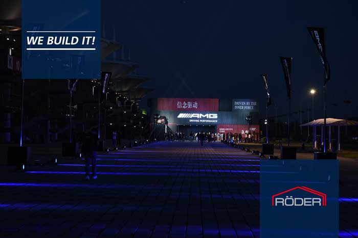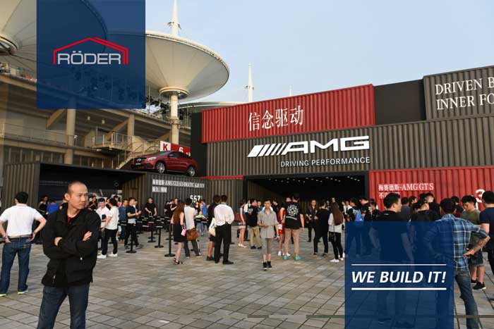 在6月39日的发布会晚宴中,瑞德尔篷房作为国际高端品牌可信赖的篷房品牌供应商,晚宴篷房采用25M跨度的晚宴篷房。300平方米的铝合金结构宴会厅,充气平顶顶层设计,活动现场容纳400人。独特的集装箱叠加式入口设计和大面积广告面展示让AMG发布会更加美轮美奂,更为宴会增添不少乐趣。房外形显得高端、优雅、整洁、大方。
