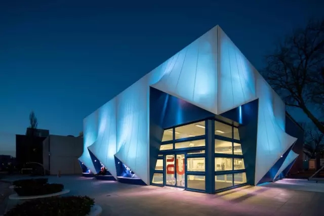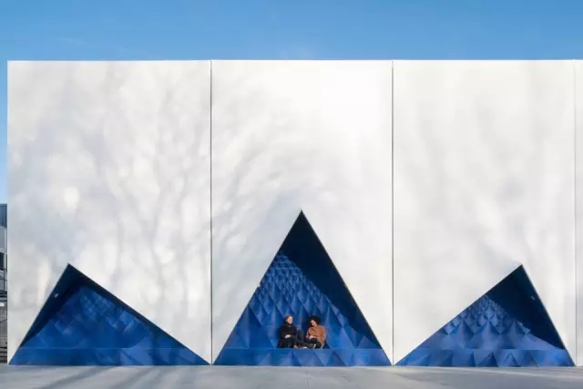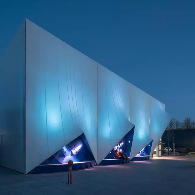 这座建筑的所在地是曾经的帆船制建造场,立面造型即是参照了这一点。凹龛将蓝色的3D打印的坐凳笼罩在下方,为人们提供庇护。打印的花样有大有小、有圆有方,代表欧盟各国的联合和多样性。到了晚上,“船帆”逐渐被脉冲灯光点亮。